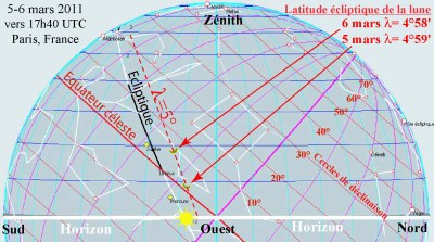 - la latitude écliptique géocentrique élevée de la Lune pour ce fin croissant des 5 et 6 mars 2011 : la lune coupe le plan de l'écliptique (Latitude écliptique= 0°) le 26 février au noeud ascendant et le 13 mars au noeud descendant, c'est à dire quelle se trouve les 5-6 mars 2011 à sa latitude écliptique maximum 5° (Voir notre dossier Lunap mouvements de la lune et la fiche résumé)