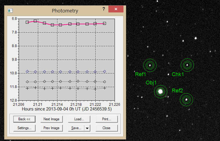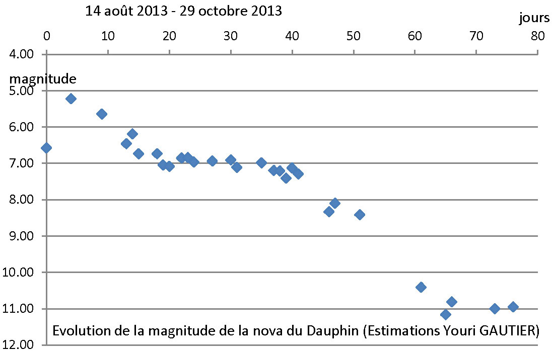 Ci-joint des estimations de la magnitude de la nova entre le 14 août et le 29 octobre 2013. Ces estimations ont été faites à l'aide du logiciel IRIS, sur les clichés que j'ai pris.