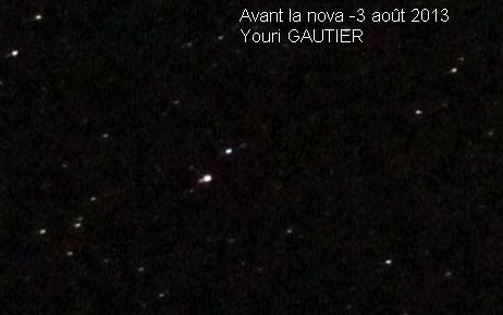 Je joins deux photos du champ de la nova, l'une prise le 3 août (donc avant la nova) et l'autre prise le 14 août. Il est facile de voir qu'il y a quelque chose de nouveau. Depuis le 18 août je la photographie presque tous les jours.