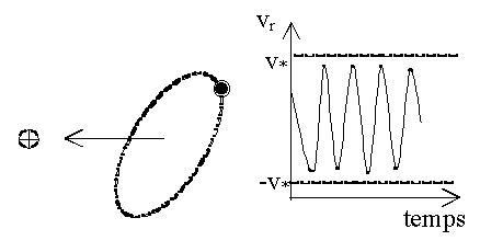 l désigne la longueur d'onde d'une raie donnée, v* la vitesse radiale (c'est-à-dire projetée sur la ligne de visée) par rapport à l'observateur et c la vitesse de la lumière. Si l'étoile est en mouvement autour d'un centre (de gravité) dû à la présence d'une planète en orbite, on mesurera donc une variation périodique de cette vitesse, la période T étant naturellement égale à la période orbitale de la planète. De cette mesure, on peut déduire :