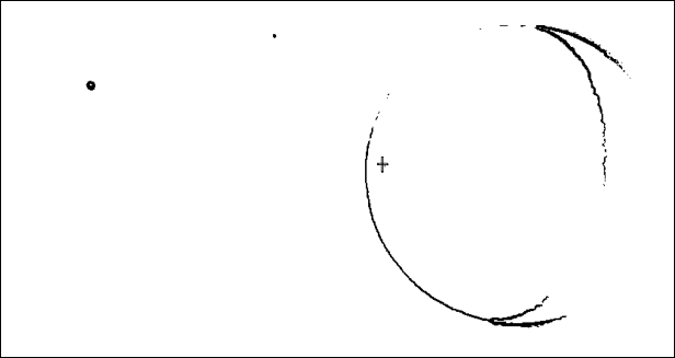 Pour vérifier ce déplacement, il suffit de superposer les deux photos. Mais il n'est pas évident d'orienter la Lune. Heureusement, quelques détails sont visibles sur le côté de la Lune dans la nuit. On a marqué d'une croix le cratère Grimaldi, sorte de cuvette sombre de 200 km de diamètre puis on a détouré la Lune grâce à un logiciel de dessin.
