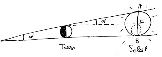 Comme on le voit sur la figure 2, l'angle du cône peut se tracer à partir de la Terre. Or le diamètre de la Terre est 100 fois plus petit que le diamètre du Soleil (on ne le saura que plus tard mais on pouvait supposer que le Soleil était bien plus gros que la Terre). Le point C peut donc se confondre avec le point B, de sorte que l'angle du cône peut effectivement se confondre avec le diamètre apparent du Soleil.
