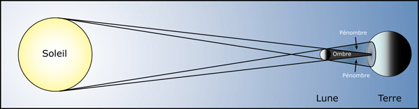 À l'opposé du Soleil, on trouve derrière la Lune une zone d'ombre ainsi qu'une zone de pénombre (figure 2).