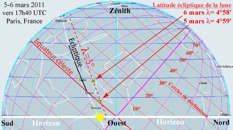 • la latitude écliptique géocentrique élevée de la Lune pour ce fin croissant des 5 et 6 mars 2011 : la lune coupe le plan de l'écliptique (Latitude écliptique= 0°) le 26 février au noeud ascendant et le 13 mars au noeud descendant, c'est à dire quelle se trouve les 5-6 mars 2011 à sa latitude écliptique maximum 5° (Voir notre dossier Lunap mouvements de la lune et la fiche résumé)