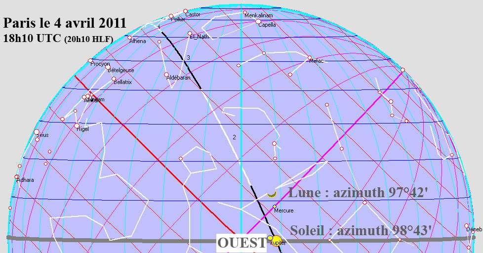 • l'orientation de l'écliptique au coucher du soleil lorsque que la date est proche de l'équinoxe de printemps