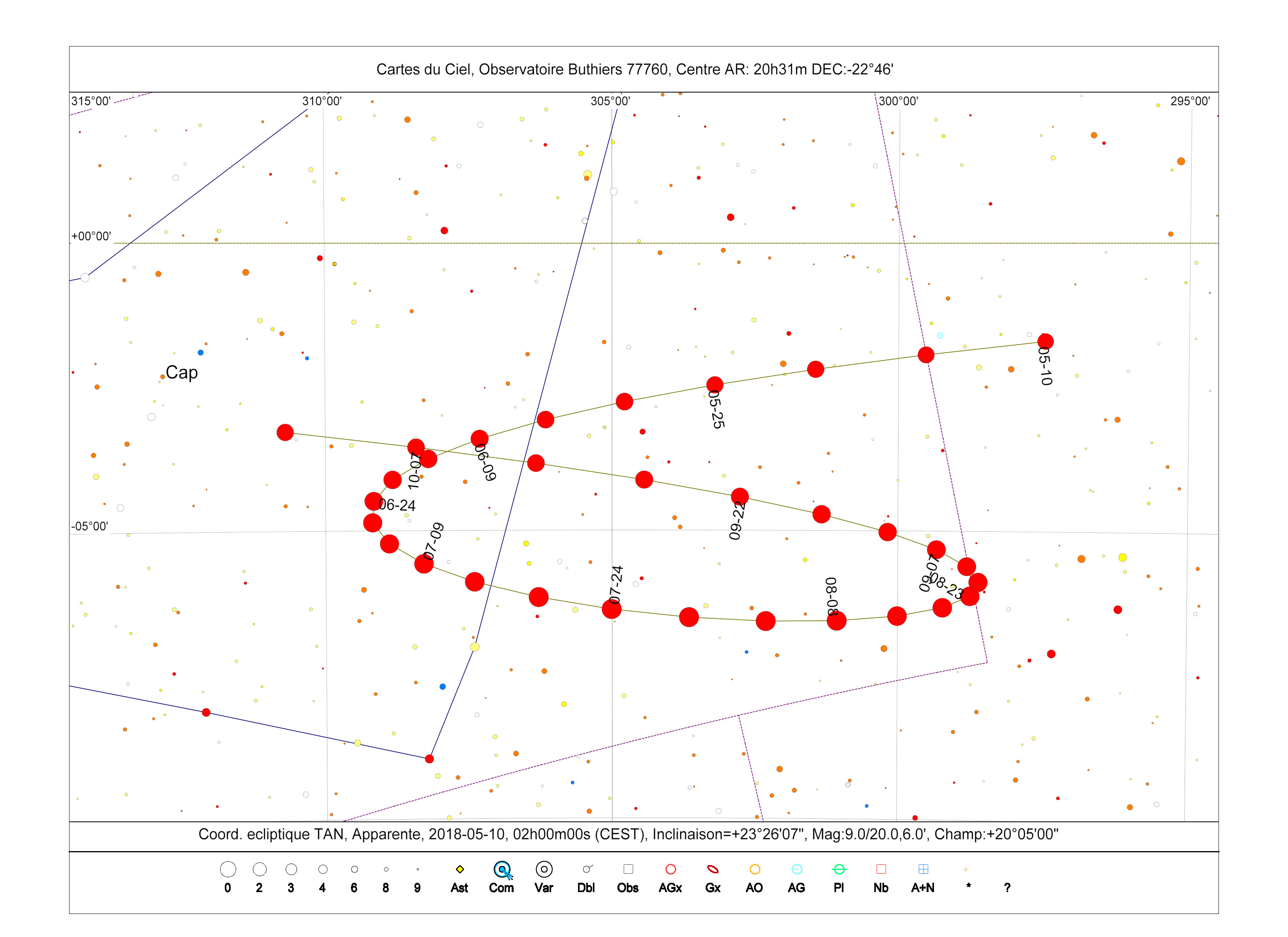 Carte de la rétrogradation 2018 (positions tous les 5 jours construction avec le logiciel "cartes du ciel" Patrick Chevalley).