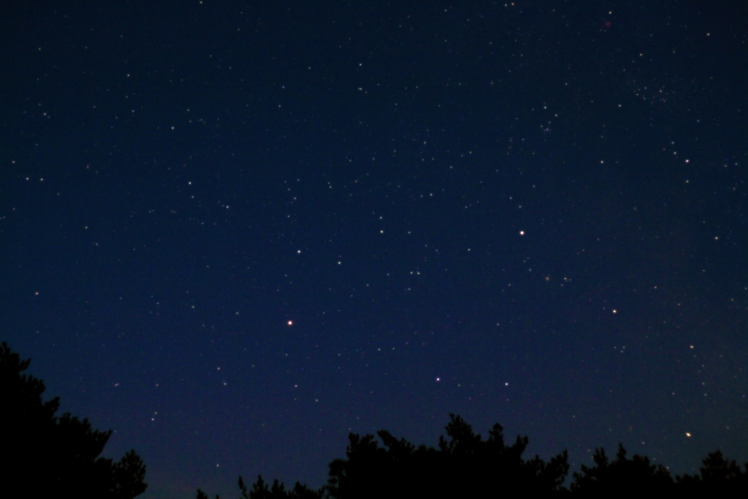 Image acquise le 18 avril 2018 à 2h45 (TU) à Buthiers (77). EOS 1000D f=50mm N=F/2.5 Tp=4s S=400Iso. Traitée avec Iris (C. Buil). Noms des étoiles et tracé des astérismes d'après Stellarium.