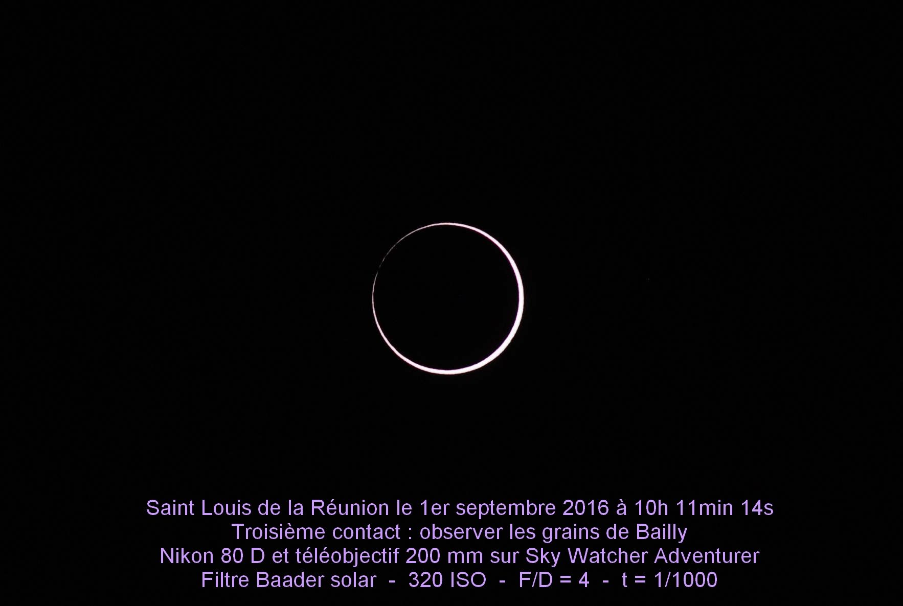 Bousculés par un fort vent venu de l’océan, les nuages ont été tenus en respect sauf pendant quelques minutes avant le maximum. Une immense clameur venue des milliers de participants « Hou ! Partez !! » a suffi à les chasser et les quelques 2 minutes 40 secondes d’annularité ont été vues dans un ciel parfait et sensiblement assombri.