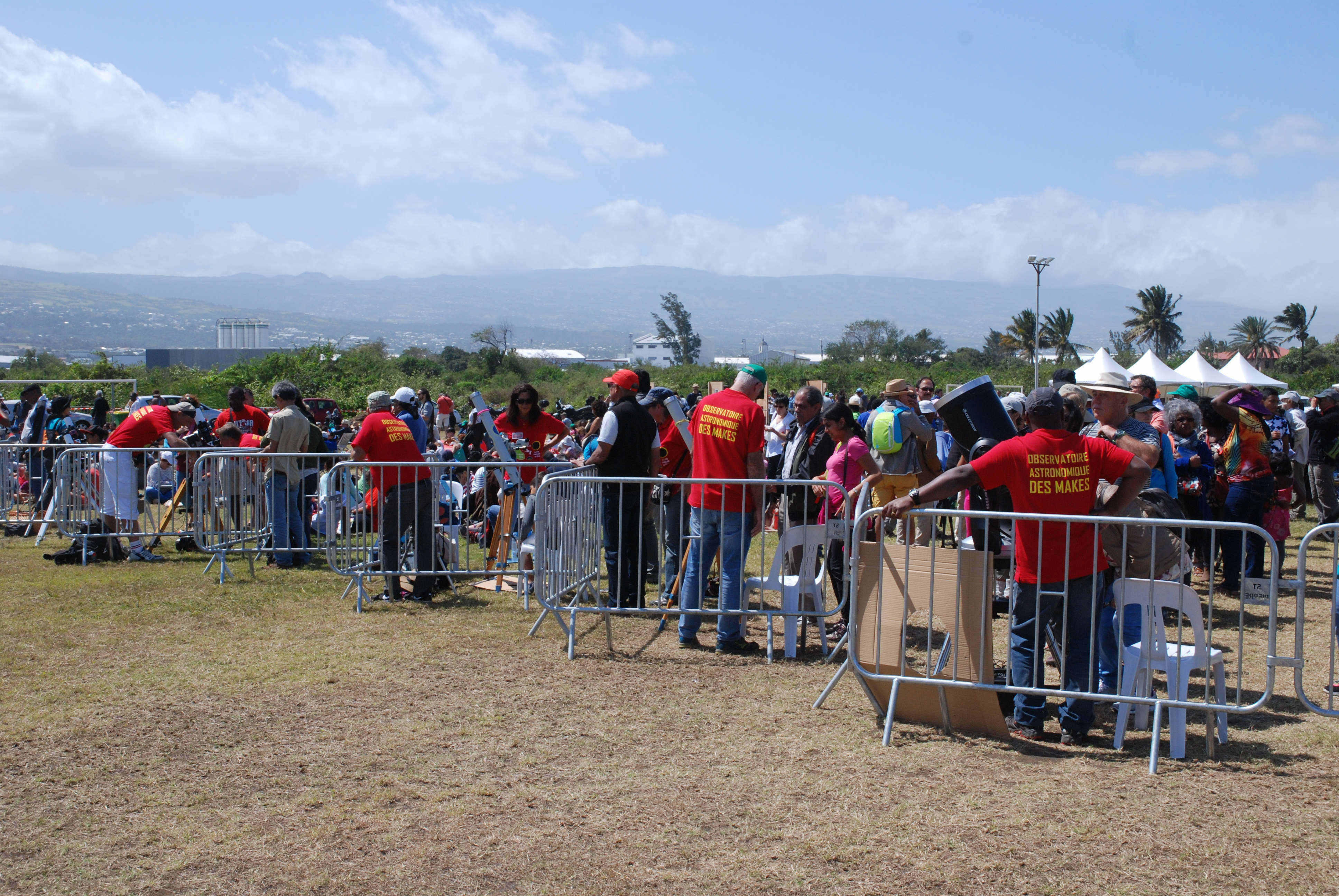 Reconnaissables à leur polo « uniforme » rouge et or, les bénévoles astronomes professionnels et amateurs, postés sur les lunettes ou les télescopes de l’AAR, ont passé ainsi la matinée à expliquer encore et encore la nature du phénomène, son intérêt scientifique, l’utilité des lunettes spéciales, l’inanité des peurs ancestrales et ... la stupidité de ceux qui avaient fui leurs responsabilités pédagogiques en faisant fermer les écoles. Pendant une partie de la matinée, Carole Hopais de l’AFA, Jimmy Dorseuil de l’AAR et moi-même avons participé à une émission spéciale sur Réunion Première, émission pendant laquelle nous avons prouvé que l’astronomie était un lieu de rencontre de science rigoureuse et de convivialité chaleureuse. Plus tard et jusqu’au premier contact, ce fut au tour de Danielle Briot (observatoire de Paris), Claire Le Lay et Geneviève Kowalewski (AAR et CLEA) et Claudie Hoareau (observatoire des Makes) de prendre le relais sur les ondes.