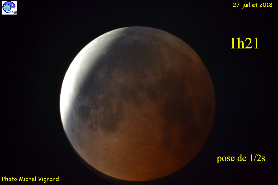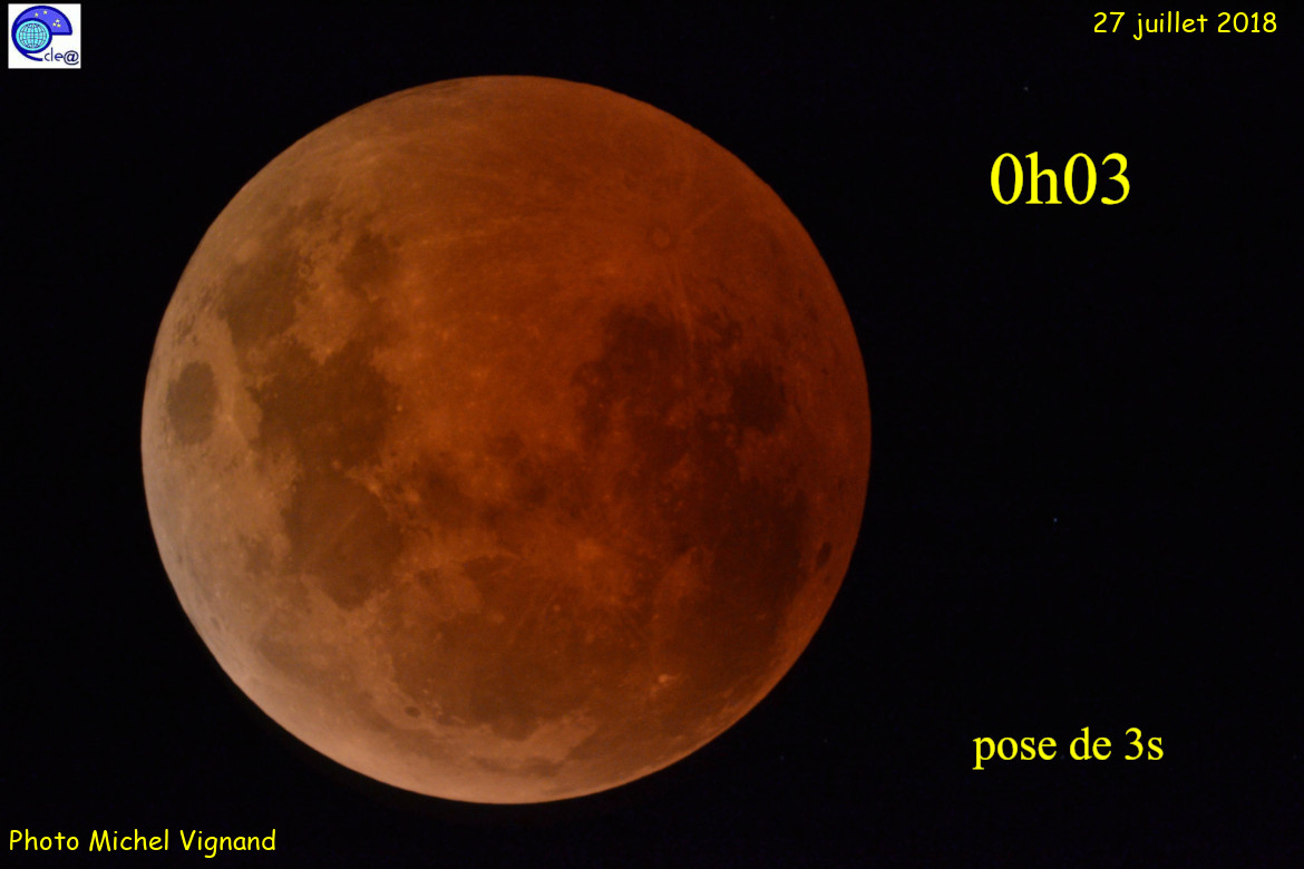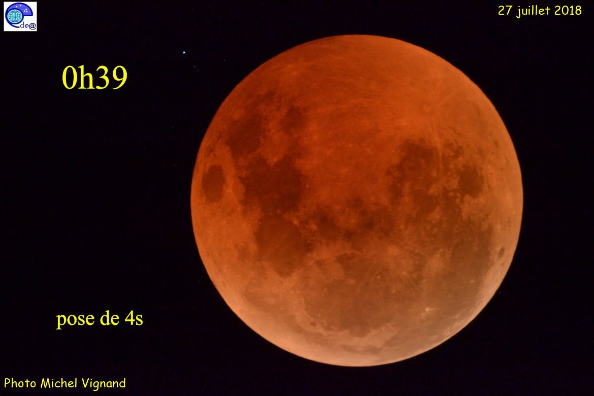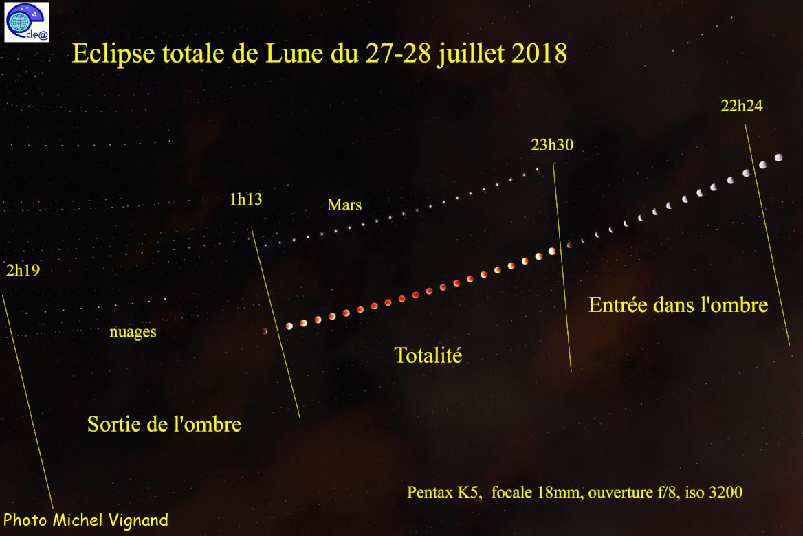 Et c'est depuis La Réunion, de l'autre côté de l'équateur et bien plus à l'est, que Michel Vignand a pu saisir les premières phases de l'éclipse avec l'entrée dans l'ombre (en métropole la Lune n'était pas encore levée) et construire un filé sur lequel on voit aussi Mars au dessus (mais toujours bien au sud) de la Lune. On y voit aussi d'autres étoiles : saurez-vous les identifier ? Dates en heures locales.