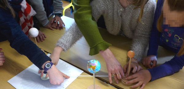 En montant le contenu de ces ateliers j'ai veillé à diversifier les démarches pédagogiques d'une même séance (de 50 minutes environ) pour toujours s'assurer de l'attention de ces jeunes publics (diaporama incluant des films, séances de questions-réponses, mises en situation des positions et mouvements des planètes, construction de lunophase/cadran solaire/carte du ciel, observation du Soleil, de la Lune...) .