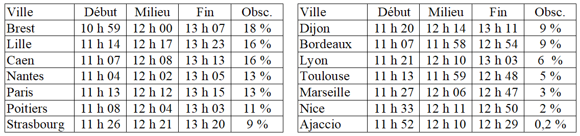 Horaires de l’éclipse et obscuration (pourcentage du disque solaire éclipsé) pour quelques villes de France, classées par ordre d’obscuration, du nord-ouest au sud-est. Les heures indiquées sont les heures légales