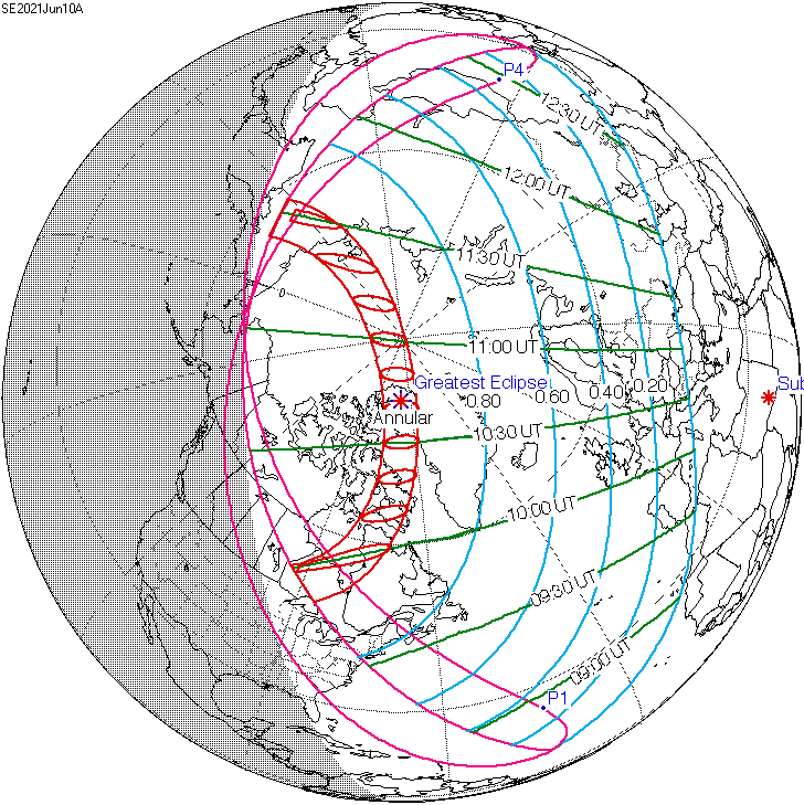 Carte de l’éclipse du 10 juin 2021 sur http://eclipse.gsfc.nasa.gov/ (Fred Espenak, NASA's GSFC)