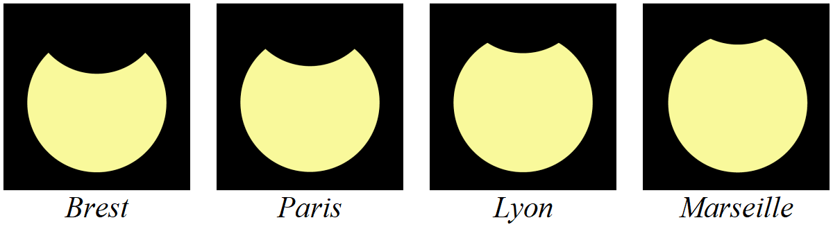 Le Soleil tel qu’il apparaîtra au moment du maximum de l’éclipse, vu depuis 4 villes de France.