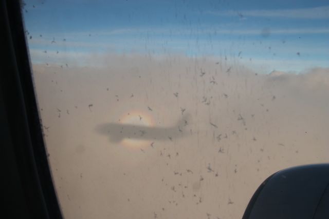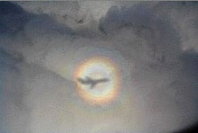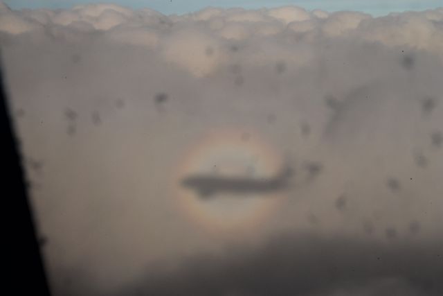 Le premier alpiniste qui l’ait vu depuis le Mont Brocken un peu avant 1800 a vu que l’ombre de sa tête sur les montagnes plus basses était « auréolée ». En fait il s’agit d’un petit spectre circulaire sur les nuages d’en-dessous (on l’appelle aussi spectre de Brocken). Pour le voir quand on prend l’avion il faut être proche d’un hublot latéral et avoir le Soleil dans le dos. C’est pour cela que ça ne se voit pas sur les lignes Nord-Sud. Non pas que le spectre n’existe pas, mais seuls les membres de l’équipage le voient quand il est à l’avant de l’avion.