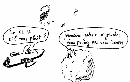 Ce dessin pourrait laisser croire que les astéroïdes sont extérieurs à notre système solaire. En fait non, les astéroïdes (ou petites planètes) gravitent autour du Soleil. Dans ce dessin nous sommes, bien entendu, dans le système solaire et le rendez-vous a lieu dans une galaxie voisine, quand le CLEA aura des correspondants académiques extragalactiques.