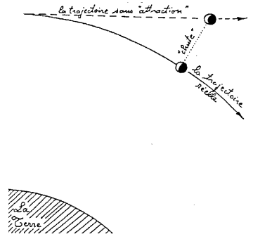 " Si ce pouvoir existe, il doit (ce qui est prouvé d'ailleurs) augmenter en raison renversée des carrés des distances. Il n y a donc plus qu'à examiner le chemin que ferait un corps grave en tombant sur la Terre d'une hauteur médiocre, et le chemin que ferait dans le même temps un corps qui tomberait de l'orbite le la Lune. Pour en être instruit, il ne s'agit plus que d'avoir la mesure de la Terre et la distance de la Lune à la Terre ".
