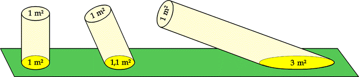 Un faisceau de lumière de 1 m² de section doit chauffer 1,1 m² s'il éclaire comme le Soleil de midi du solstice d'été (66° au dessus de l'horizon). Par contre, s'il éclaire en lumière rasante comme le soleil du solstice d'hiver à midi (20° au dessus de l'horizon), il doit chauffer 3 m² : le sol reçoit donc beaucoup moins d'énergie au m² et il fait plus froid.