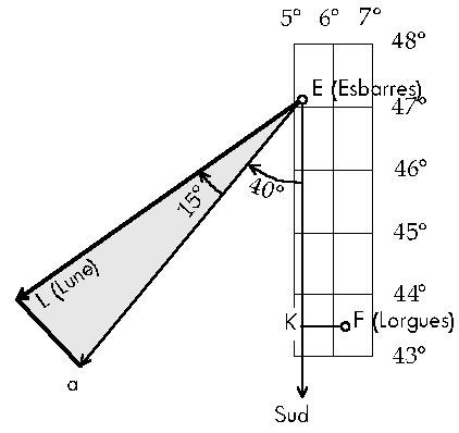 On découpe les deux côtés épais de la partie grisée, on plie suivant (Ea) et on obtient la direction de la Lune observée depuis Esbarres. Il suffit ensuite de mesurer la distance d de F à (EL).