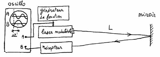 | Une grande difficulté fut de recevoir l'écho sur le récepteur après la réflexion sur le miroir lointain. Le faisceau réfléchi subit une diffraction par le miroir et le retour ne se présente pas comme un beau spot illuminant la photodiode réceptrice. Il faut être deux pour faire l'expérience. Le premier règle le miroir, le second regarde l'oscilloscope et guide le réglage de l'orientation du miroir. Quand l'écho est reçu et qu'on voit une belle sinusoïde sur l'oscillo, le plus dur est fait. Reste à mesurer la longueur du tunnel au milieu des détritus et des toiles d'araignées. Insistons sur un dernier point important. Nous avons envoyé directement sur une seconde trace de l'oscillo le signal du modulateur sinusoïdal (celui la même qui est envoyé sur le laser). Cette seconde trace nous fournissait une origine fixe pour mesurer le temps de chaque trajet aller-retour, à une constante additive près (le déphasage inconnu de l'électronique). Le temps cherché était simplement la différence entre les deux Dt. |