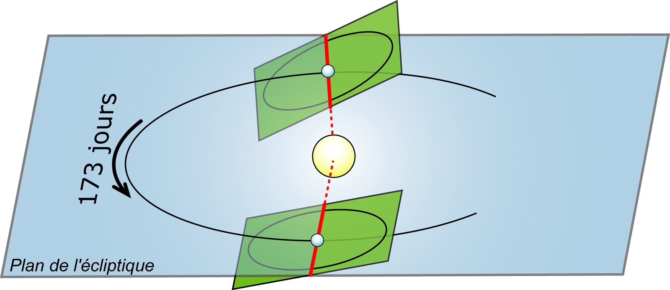 La ligne des nœuds n'est pas fixe dans l'espace contrairement à ce qui est montré sur la figure 7. Elle se déplace en tournant dans le sens rétrograde (le sens des aiguilles d'une montre vue du nord) avec une période de 18,6 ans. Ainsi, entre deux passages de la ligne des nœuds par le Soleil, il s'écoule un peu moins de 6 mois, plus précisément 173,3 jours (fig.8). On parle aussi d'année draconitique de 346,6 jours, qui est l'intervalle de temps entre deux passages du nœud ascendant entre la Terre et le Soleil (le dragon est le symbole des éclipses dans de nombreuses civilisations d'Asie).