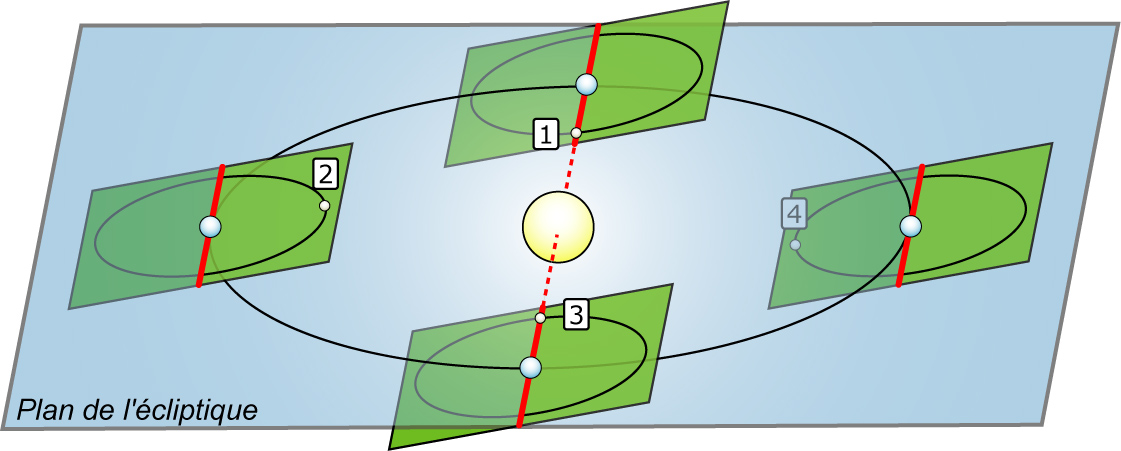 Figure 7. La ligne des nœuds est représentée en rouge. Le plan de l'orbite lunaire est en vert et le plan de l'écliptique en bleu.